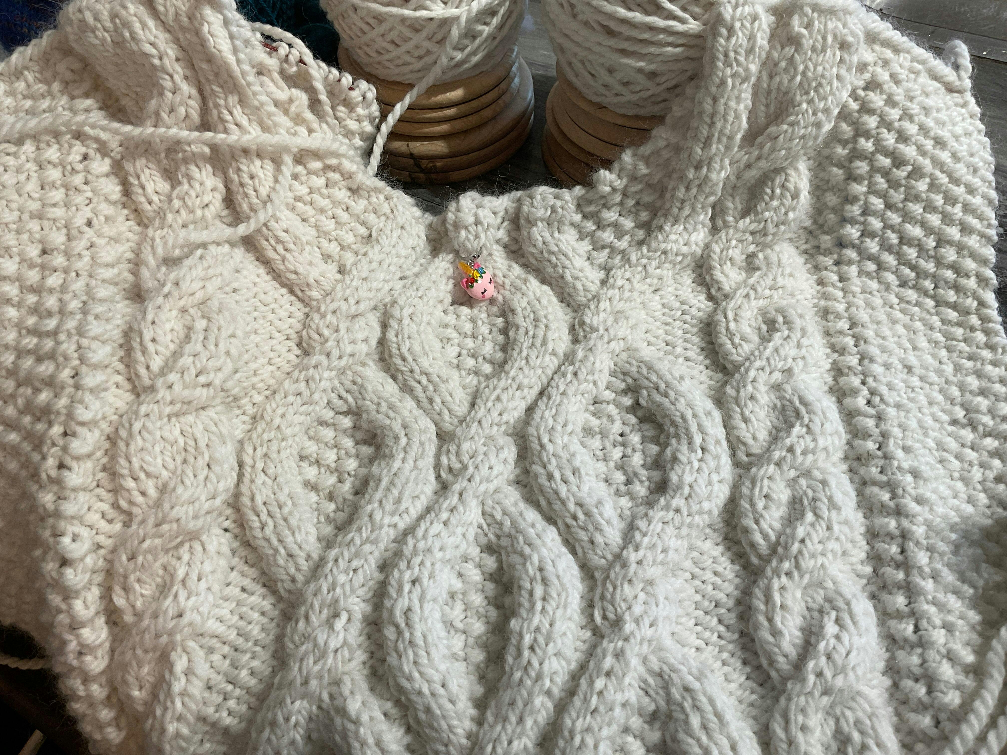 Je tricote un gros pull à torsades de chez Drops Design.
