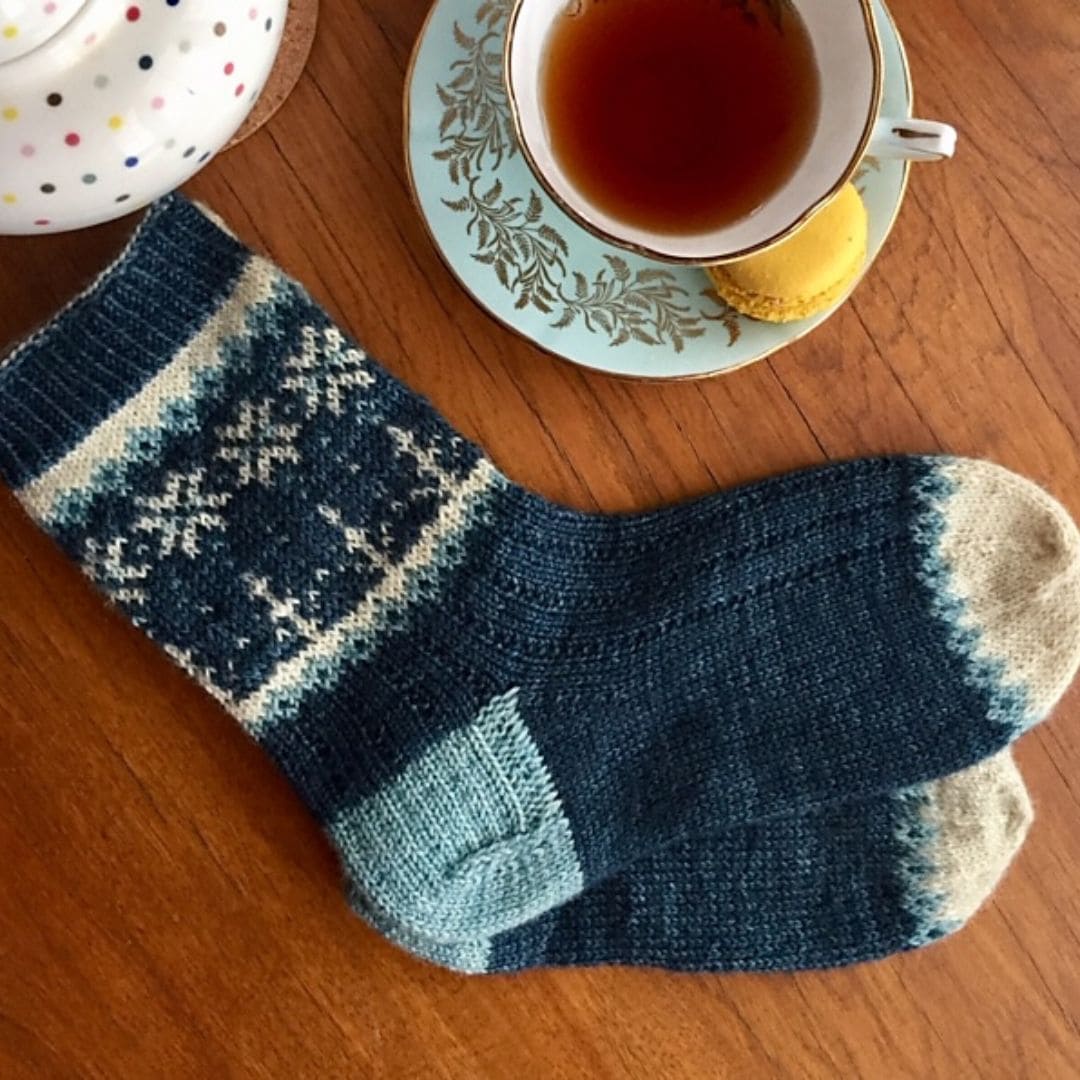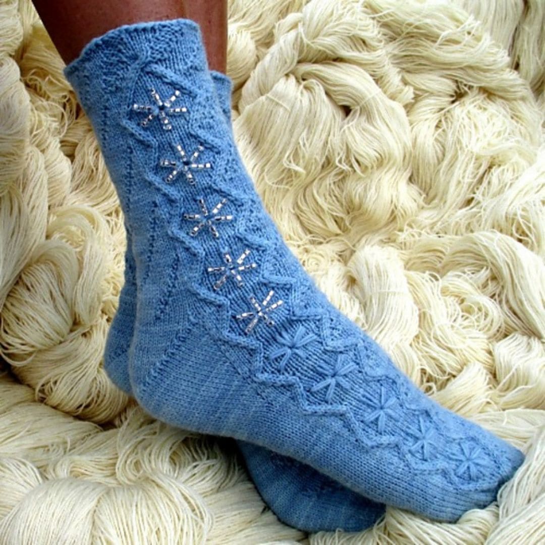 These socks, adorned with sparkling snowflakes and misty swirls, are designed to bring a touch of magic to your winter days. Knitted from the toes up, they offer a unique method for incorporating beads, similar to embroidery, but worked entirely directly into your knitting as you progress.