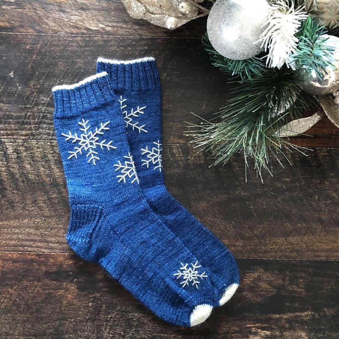 The "Snowstar" socks combine simplicity and creativity with an elegant snowflake motif embroidered after knitting. The choice of blue and white colors evokes the contrast between snow and sky. This easy-to-make pattern allows you to explore the fusion of knitting and embroidery, creating unique and personal pieces. A perfect project for those who want to explore new textures while adding a touch of winter magic to their creations.