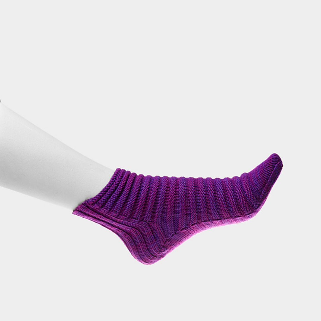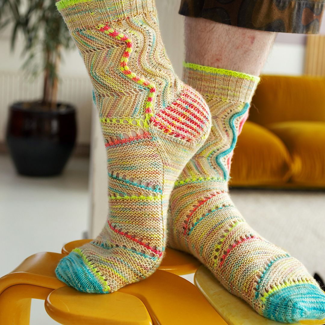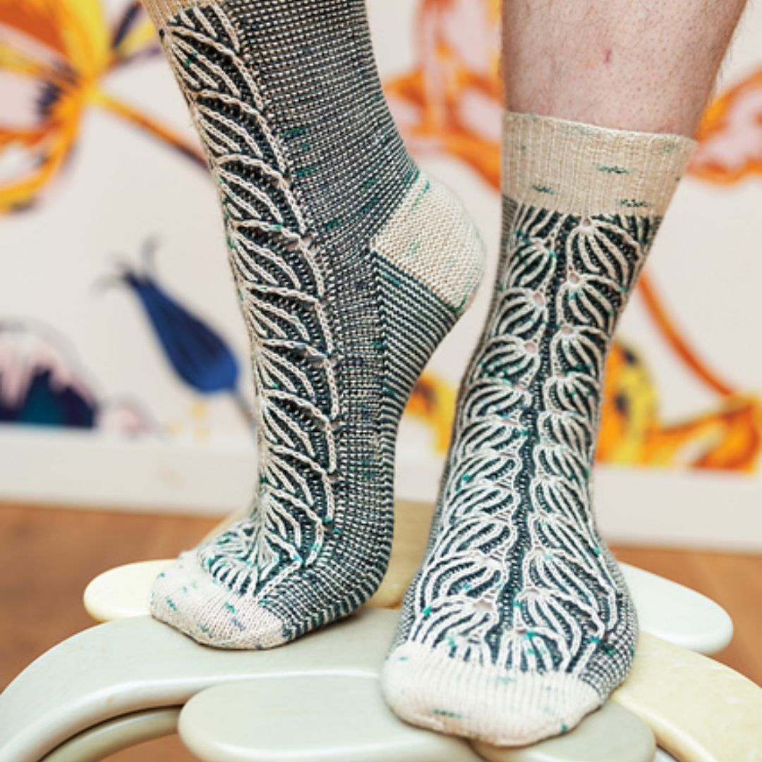 These socks feature an unusual modular construction: the upper is knitted flat before the rest of the foot is shaped. Whether it's herringbone, wave, eyelet, garter stitch, or brioche stitch, each section adds its own texture and rhythm to this design, which is as stunning as it is fun to make.