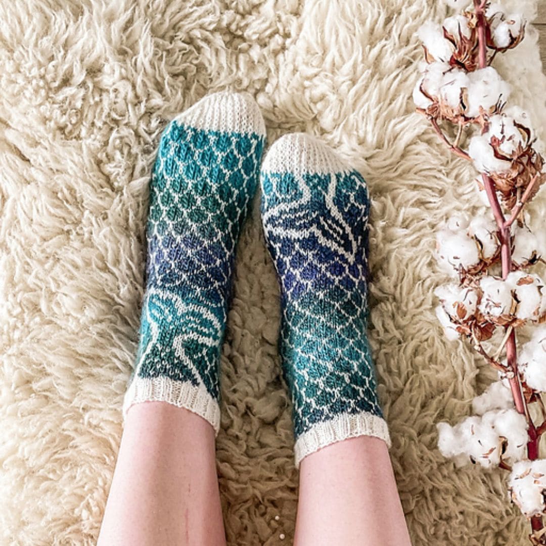 Dive beneath the waves! This aquatic-hued jacquard design evokes the foam and mysteries of the ocean. A delicate and immersive design for socks that will take you underwater.