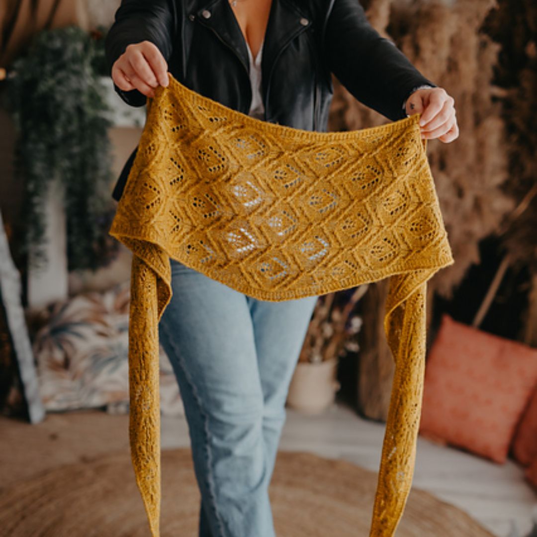 The "Scarflette" is a short and elegant scarf that adds a touch of sophistication to any outfit. This easy-to-knit pattern features lace motifs reminiscent of delicate autumn leaves. Its practical design keeps you warm while remaining stylish, making this scarflette the perfect accessory for cool fall days.
