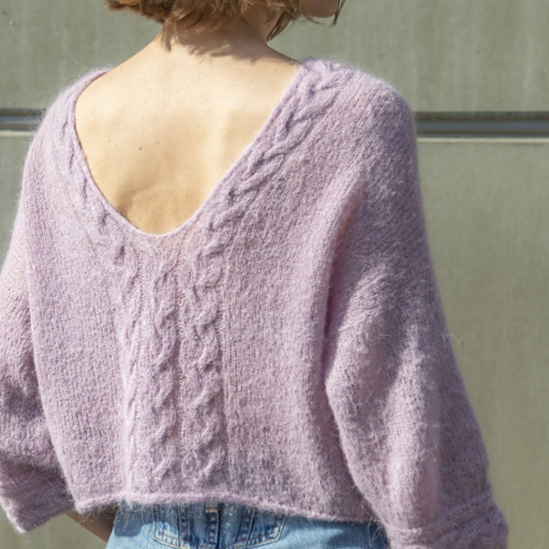 The Rapunzel blouse is a lightweight blouse with a striking back. A V-shaped back, front neckline, and cuffs are accentuated by a simple cable stitch. The blouse is modeled short and has 3/4-length sleeves, but can easily be made longer.