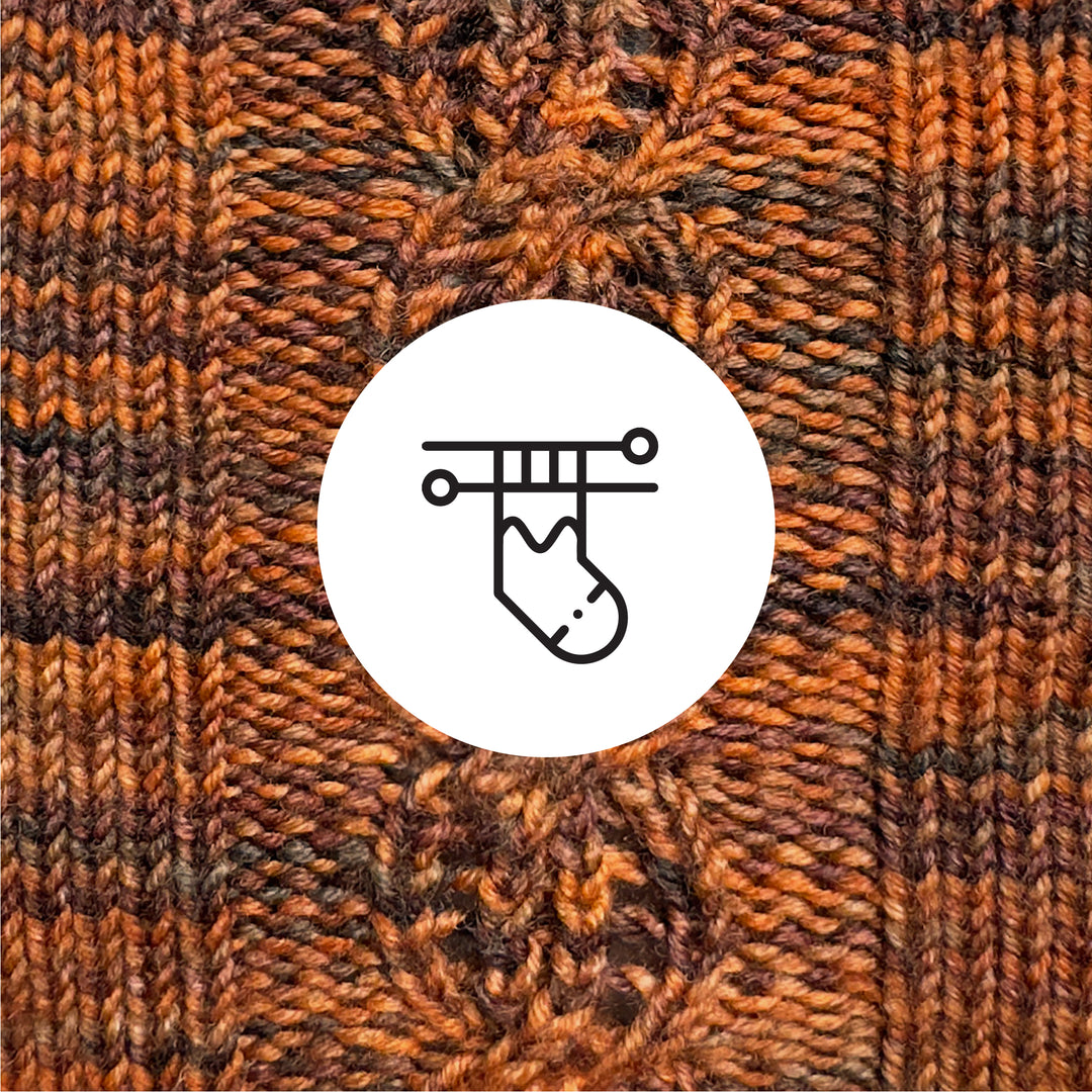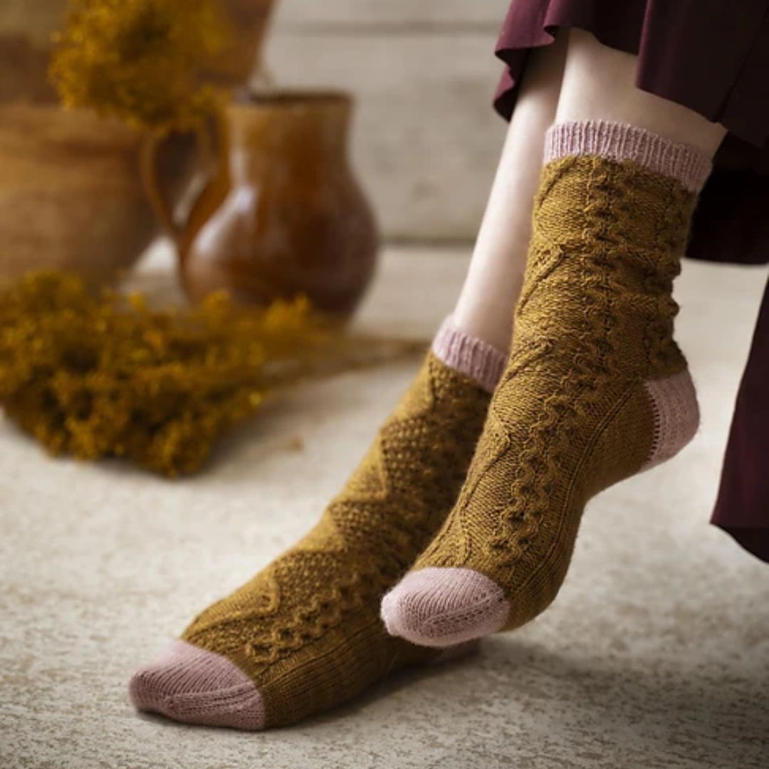 A knitted sock design that showcases elegant and intricate cables, creating a harmonious and sophisticated effect. The pattern is reminiscent of a symphony of intersecting lines and textures, giving each pair a refined and crafted look.