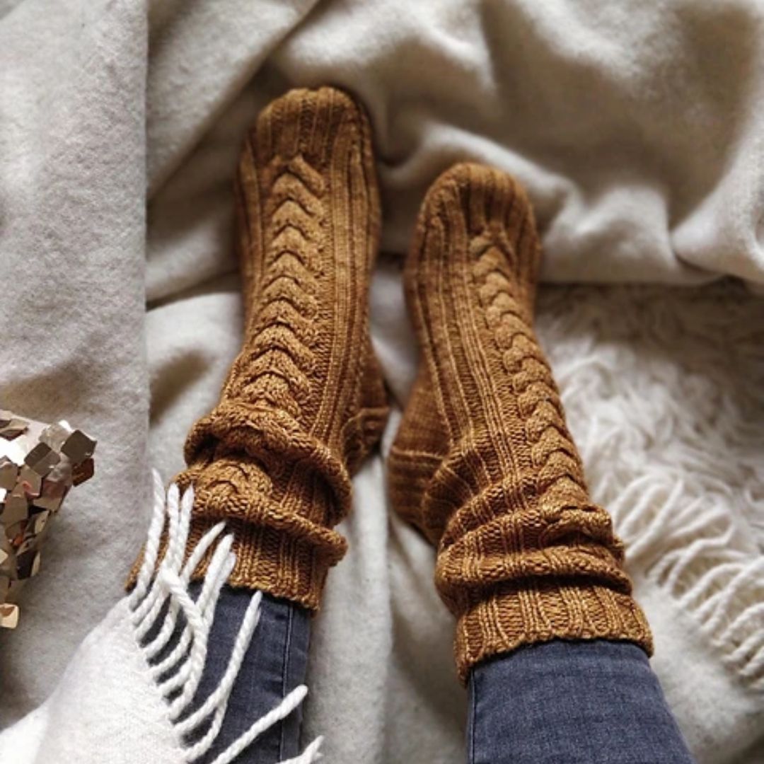 This pattern embodies everything we love about fall: warmth, comfort, and a hint of sophistication with delicate cables running throughout the pattern. Their refined design and plush texture are reminiscent of cozy evenings by the fire.