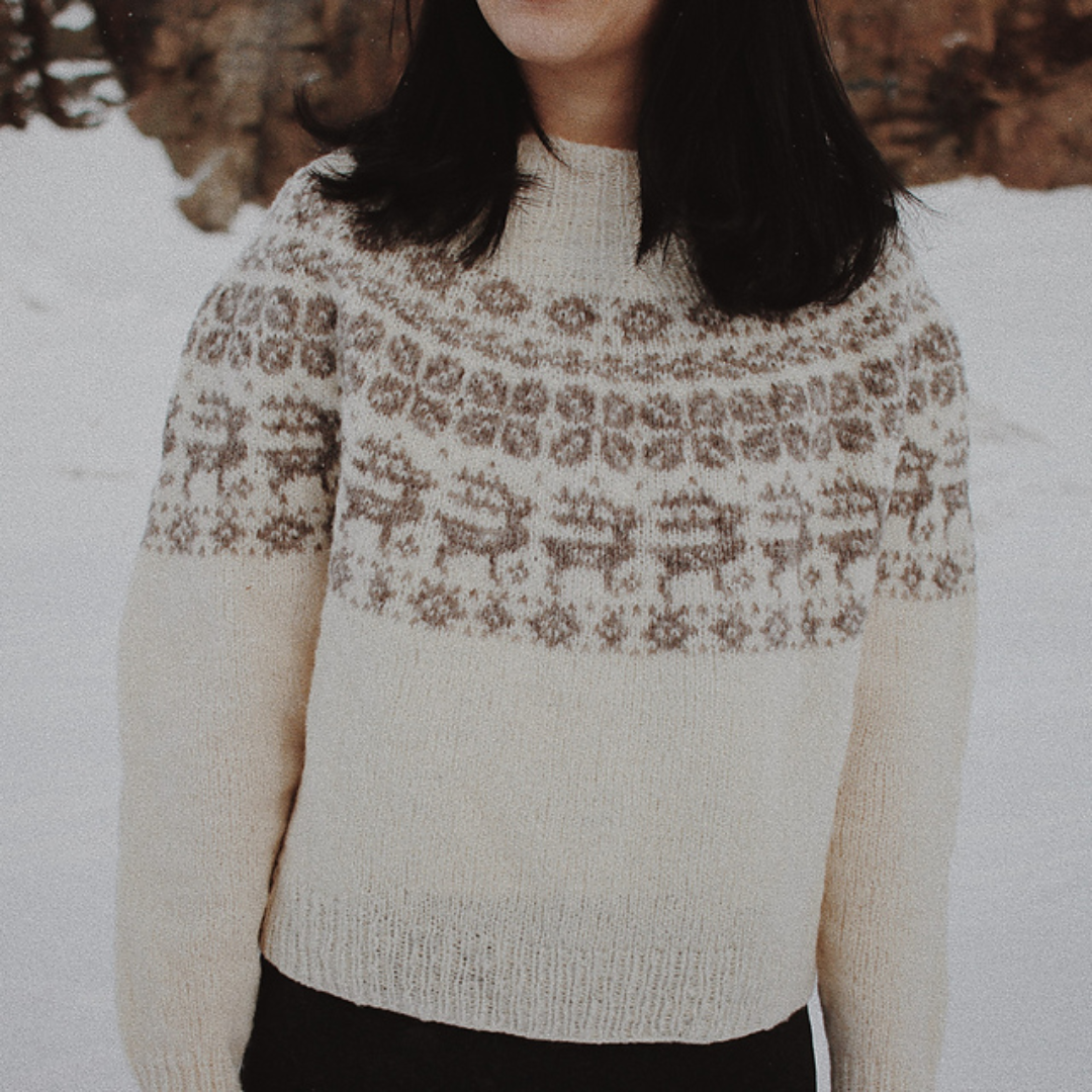Immerse yourself in the wild and soothing world of the Great White North with The Petite Knitter's "Caribou Crossing" sweater. This classic jacquard design, inspired by caribou migrations, blends traditional patterns with modern lines for a timeless result. Knitted in thick wool, it will envelop you in warmth while highlighting the color contrasts and Nordic patterns.