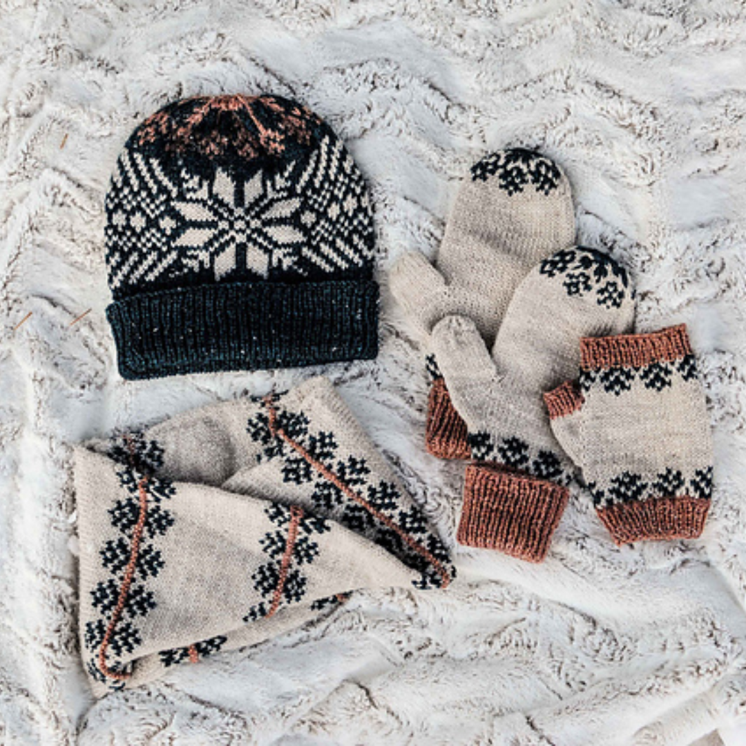 Shaina Bilow's "Imogene Collection" combines a shawl, hat, and mittens in an elegant set with refined, textured patterns. These coordinated accessories, perfect for winter days, combine warmth and style while offering a knitting experience thanks to their subtle raised stitches. Whether you make each piece separately or the complete set, this collection adapts to all your needs with a timeless touch.