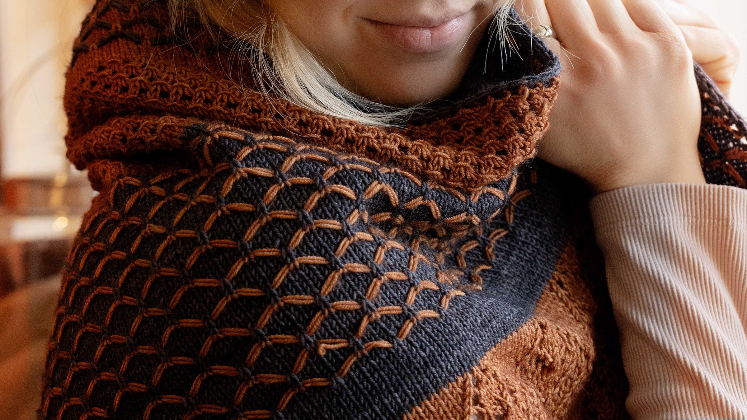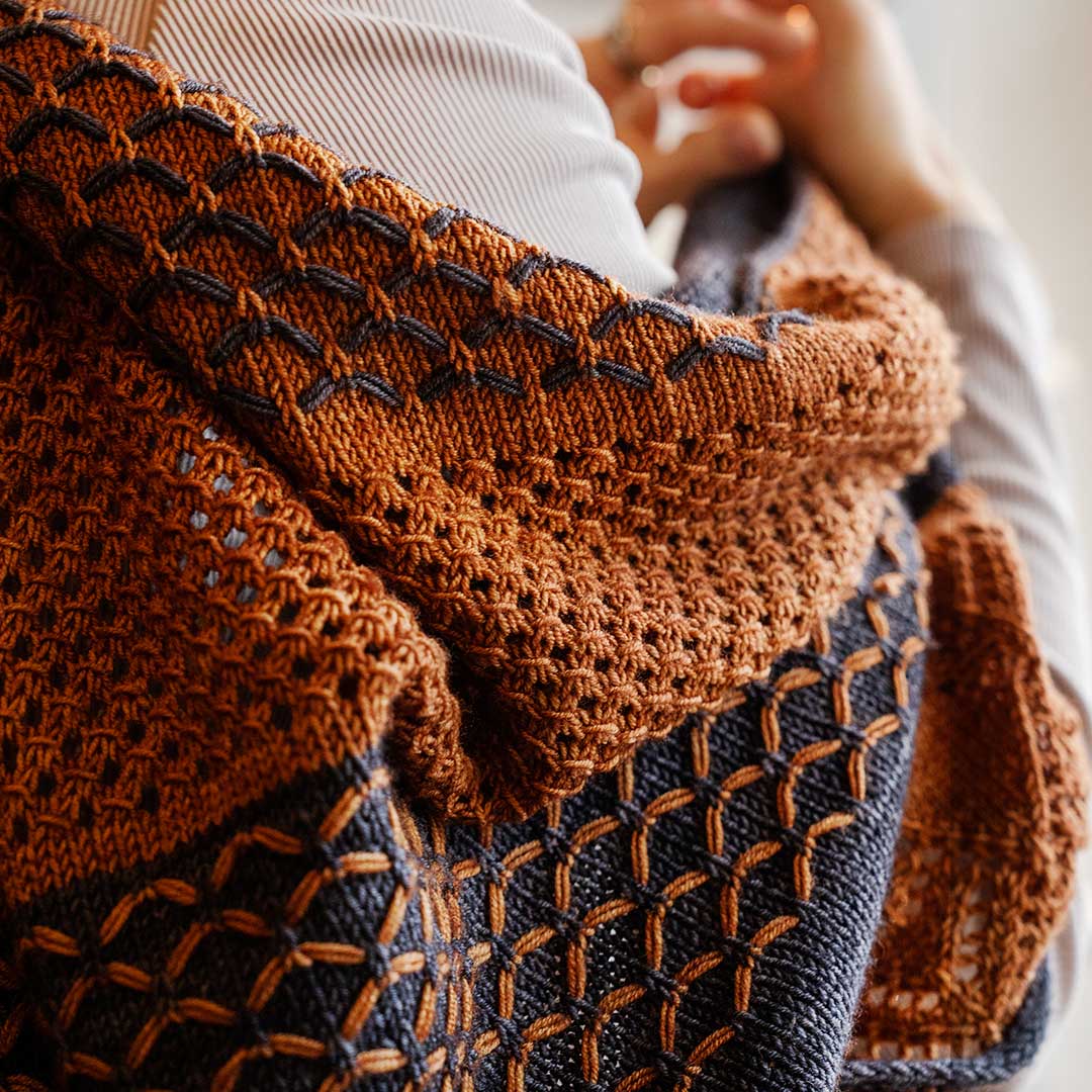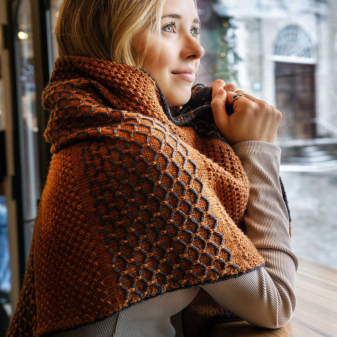 Discover an elegant shawl with its play of textures and refined details. This intermediate model promises a most enjoyable knitting experience. It comes in a variety of superb color combinations; let yourself be carried away by the melody of the stitches and create a unique piece!