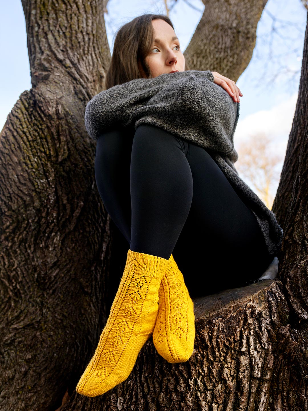 Les chaussettes Pâquerette, c’est un délicat motif de dentelle qui évoque les fleurs des champs, tricoté dans un fil lumineux et ensoleillé. La construction commence par la jambe, avec un motif qui émerge doucement des côtes pour filer jusqu’à la pointe du pied, dans une belle continuité. Le talon Fleegle, sans couture, épouse parfaitement la forme du pied pour un confort optimal.