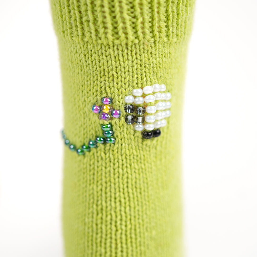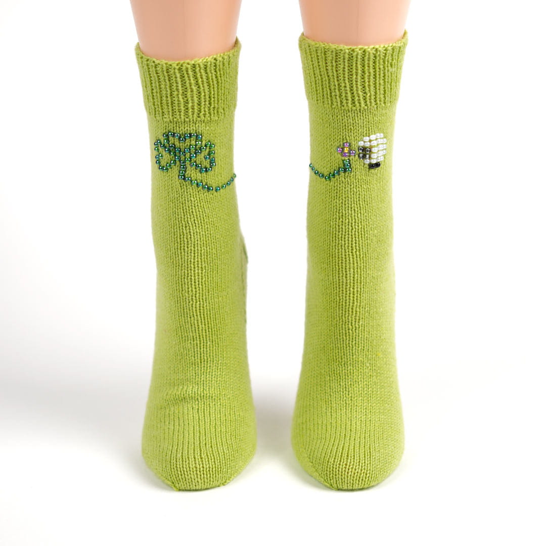 Un trèfle apparaît sur l’une des chaussettes et sa tige se prolonge délicatement pour rejoindre l’autre, créant un lien entre les deux pieds. Ce symbole de chance évoque l’esprit festif et chaleureux de la Saint-Patrick et rend hommage à l’Irlande.