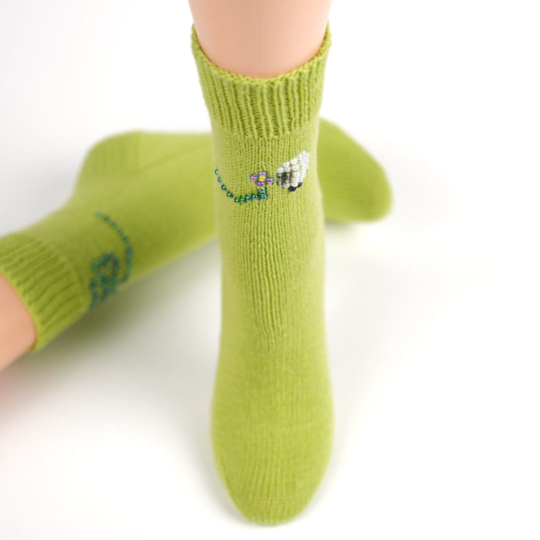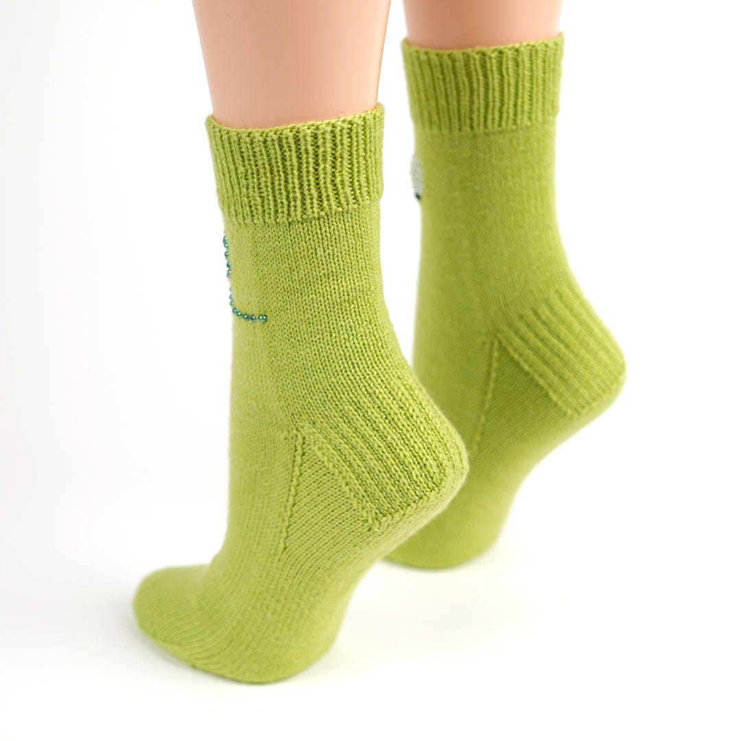 Les chaussettes se tricotent à partir de la jambe avec un talon double, ou à partir de la pointe selon votre préférence. Une grandeur de base est proposée, avec la possibilité d’ajuster les mailles.