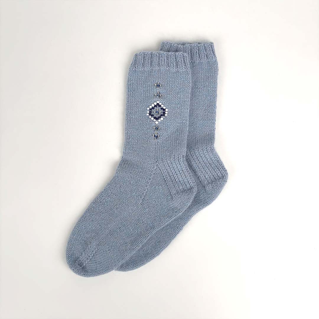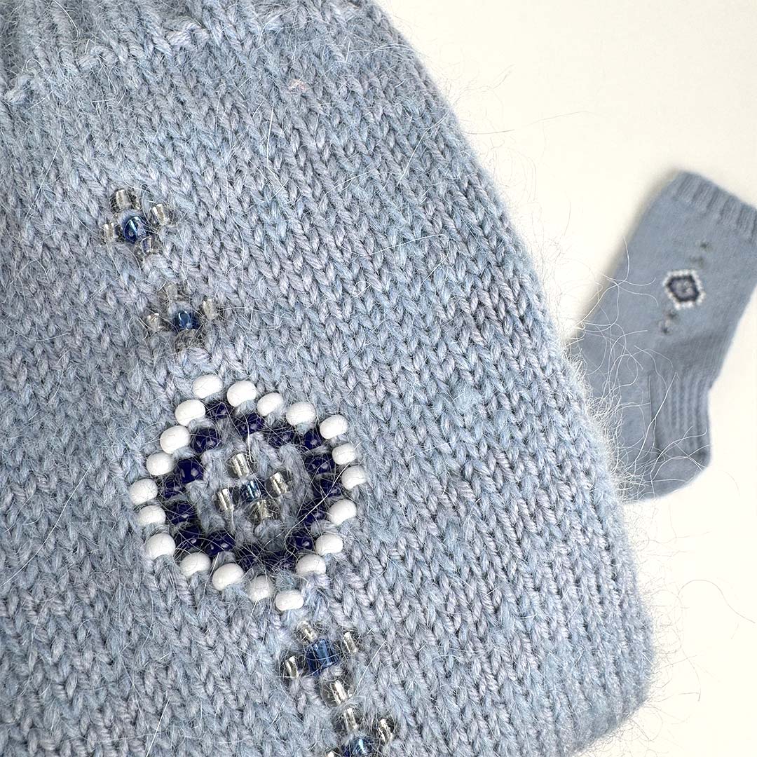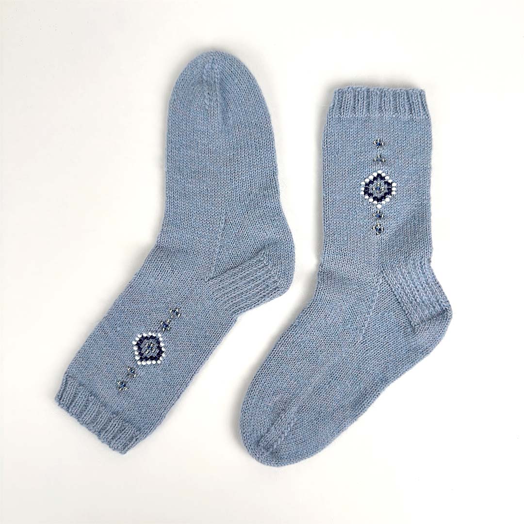 Voici le quatrième patron de la collection de 12 modèles de chaussettes. Cette édition du mois de mai s’inspire d’un motif diamant délicat, rehaussé de perles insérées directement dans le tricot.