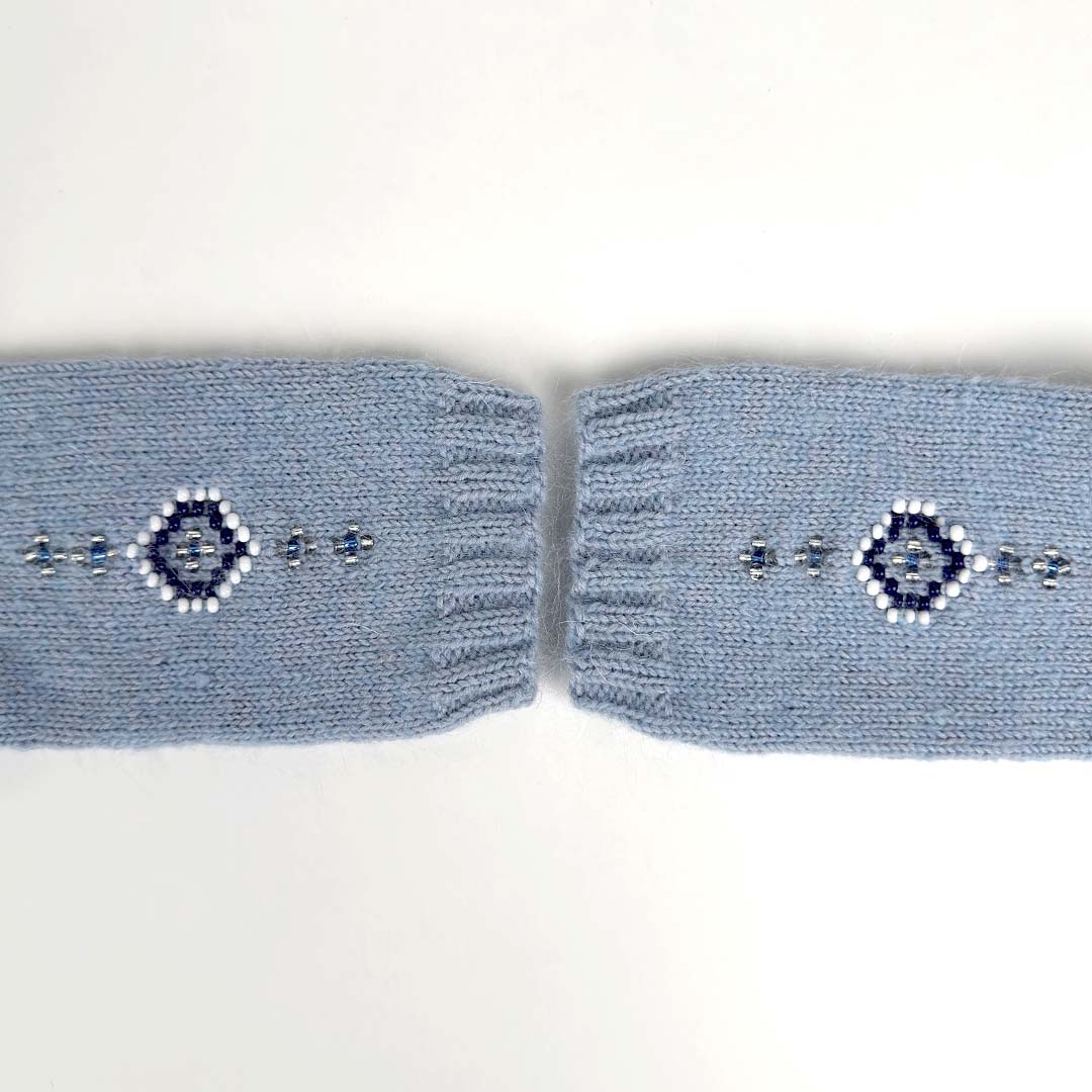 Le motif reprend les diamants présents sur les manches du chandail Diamond Sleeves de Pope Vergara. Placé sur le côté de chacune des chaussettes, le dessin est subtilement souligné par de petites perles qui ajoutent une touche lumineuse et raffinée.